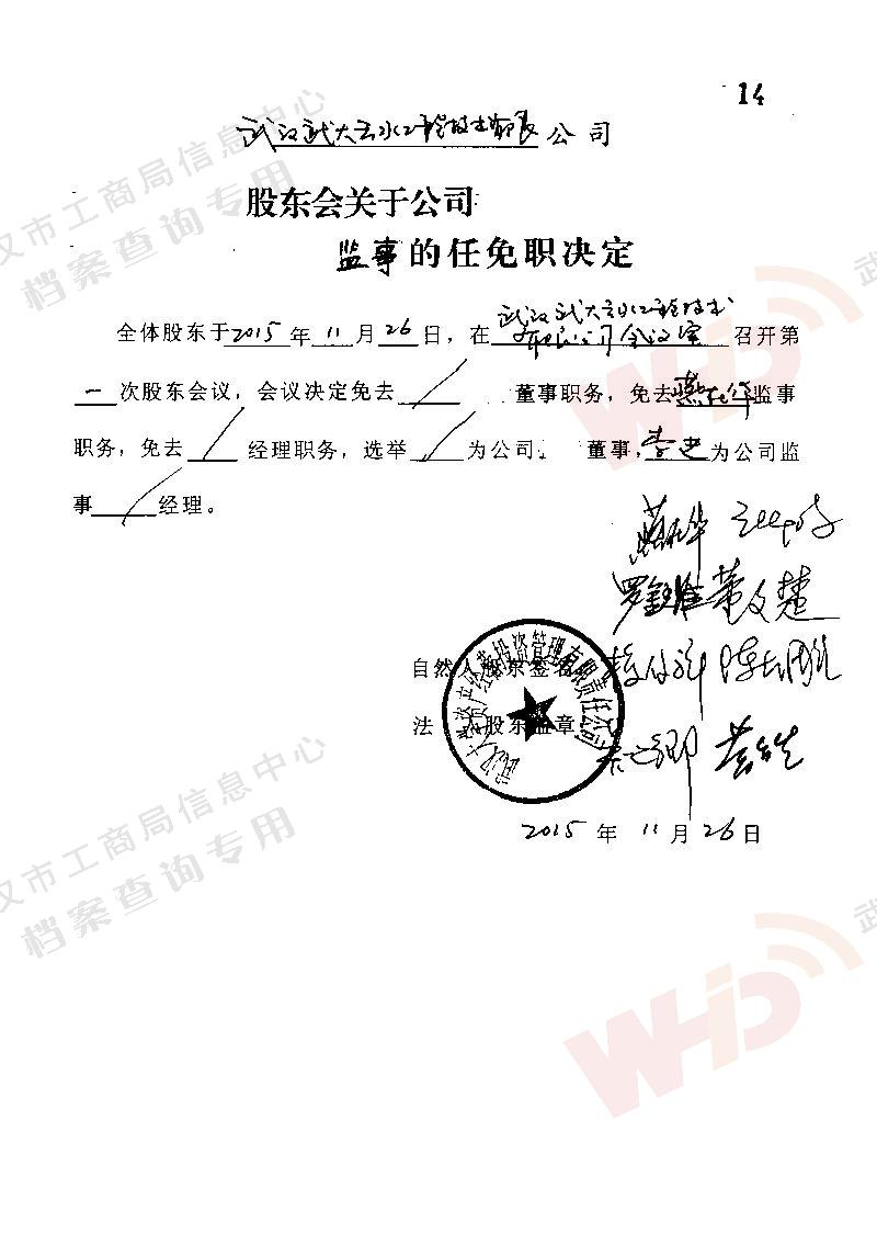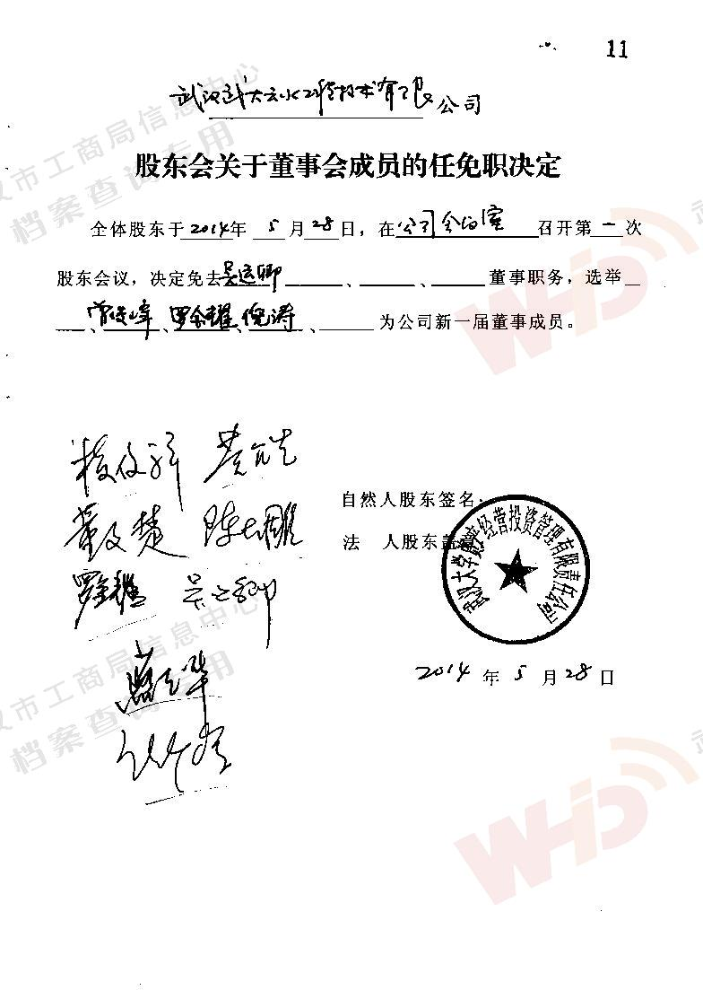 - 2009年11月15日武漢武大云水工程技術(shù)有限公司三屆一次董事會決議: 一、決定聘請談廣鳴為公司名譽(yù)董事長。 二、決定選舉季玉明為公司董事長,公司法人代表。免去燕在華公司董事長職務(wù)。 三、經(jīng)董事長季玉明提名,決定聘任羅金耀為公司總經(jīng)理。 四、經(jīng)公司總經(jīng)理提名,決定聘任劉軍強(qiáng)為公司副總經(jīng)理。 五、經(jīng)公司總經(jīng)理提名,決定聘任龔明新為公司財(cái)務(wù)總監(jiān),燕在華為市場總監(jiān),陳大雕為技術(shù)總監(jiān),董文楚為研究所所長。 經(jīng)董事長提名,決定聘任萬玲為董事會秘書。