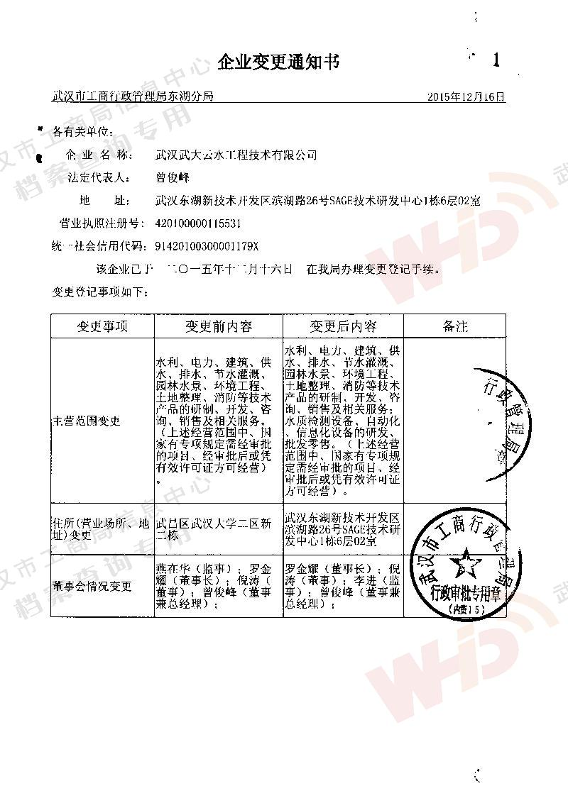 - 2003年7月25日公司名變更為武漢武大云水工程技術(shù)有限公司。武漢大學(xué)同意使用“武大”冠名。
