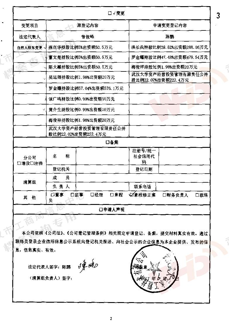 - 2003年9月29日武漢大學(xué)國有資產(chǎn)管理辦公室無償將所持有股份中的30%給與陳大雕課題組。